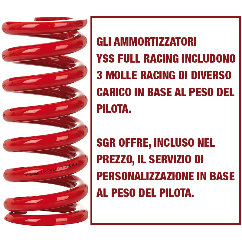 I Road Racing non hanno molle di ricambio incluse. SGR, sulla base delle informazioni ricevute dal cliente sul peso e sull’utilizzo principale, valuterà se la molla va sostituita e in tal caso cambierà la molla standard con una di diverso carico.